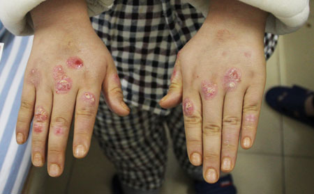 牛皮癣也会发生在指甲部位,称之为指甲牛皮癣,其临床表现为,会在甲板上有点状凹陷,甲板不平,同时失去光泽,有时甲板出现纵嵴、横沟、混浊、肥厚、游离端与甲床剥离或整个甲板畸形、缺如,有时呈甲癣样改变。